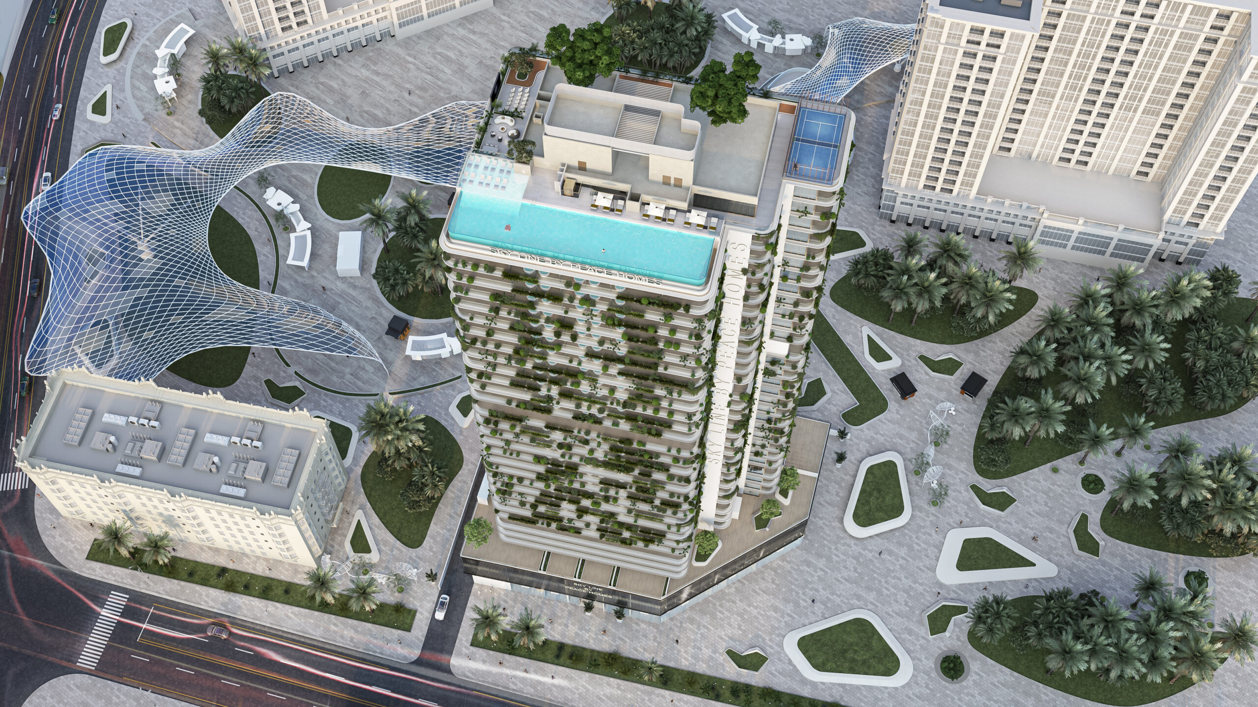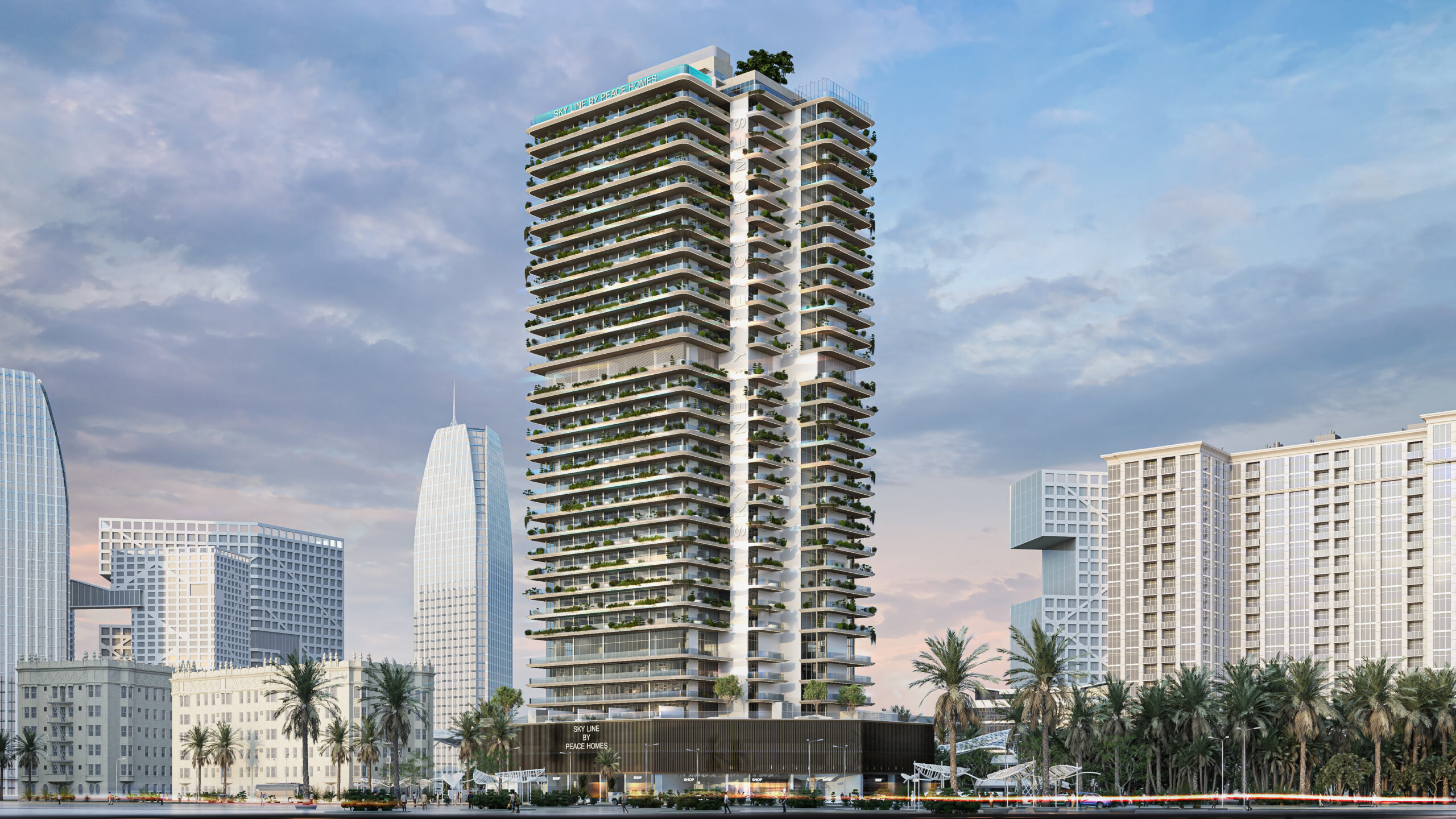 Sky Line by Peace Homes at DubaiLand Residence Complex, Dubai, is a distinctive mixed-use development designed to elevate modern urban living. Rising elegantly with five basement levels, a grand ground floor, two podiums, dedicated office floors, and residential levels from the 5th to the 28th floor, the project seamlessly blends residential comfort with commercial convenience. Its thoughtfully planned structure reflects a vision of contemporary architecture that caters to both lifestyle and business needs within one integrated destination.